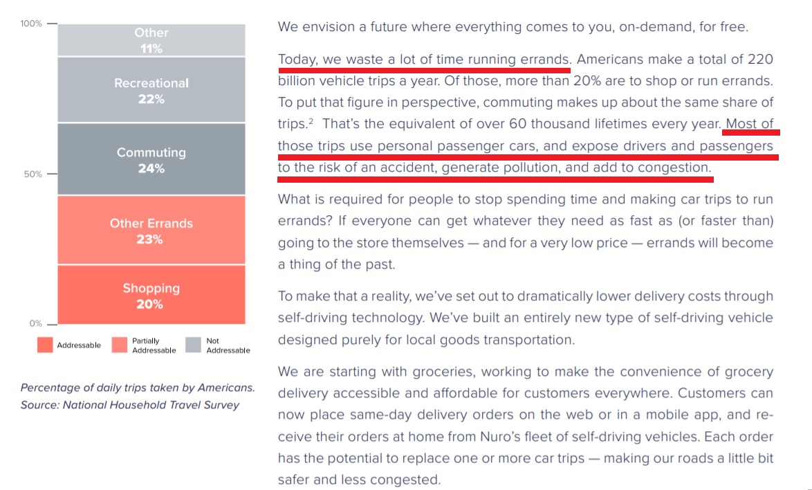미국인들의 차량 이용의 목적의 23%가 Errands에 속한다고 합니다. 쇼핑이나 기타 Errands의 비율이 전체 43%가 되는데, 즉 자동차를 운행하는 전체 시간의 절반을 줄여주면 그만큼 교통 사고 위험에 노출되는 빈도도 절반으로 줄일 수 있다는 주장입니다. 그래서 Nuro는 쇼핑이나 기타 Errands를 무인자율주행차로 대체 함으로서 개개인이 교통 사고의 위험(및 환경 오염 노출)을 줄여 보행자 안전을 증진시키겠다는 비전을 보여줍니다.